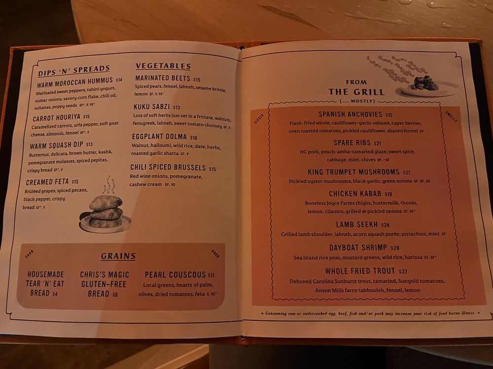 Welcome to Ajja, the hidden gem of Raleigh's culinary scene, located at 209 Bickett Blvd. This Middle Eastern restaurant invites you to indulge in a vibrant menu that showcases a fusion of flavors and ingredients. Signature dishes, such as the Warm Moroccan Hummus and Dolma-stuffed Savoy Cabbage, are not only delicious but also artfully presented, making every bite a delight. Guests rave about the King Trumpet Mushrooms and the delightful Happy Tears cocktail, a unique blend of reposado tequila and raspberry. The ambiance is eclectic, and you can opt for outdoor dining with a cozy atmosphere, ideal for savoring their exquisite cocktails like the Rosy Negroni or Balmy Old Fashioned.
